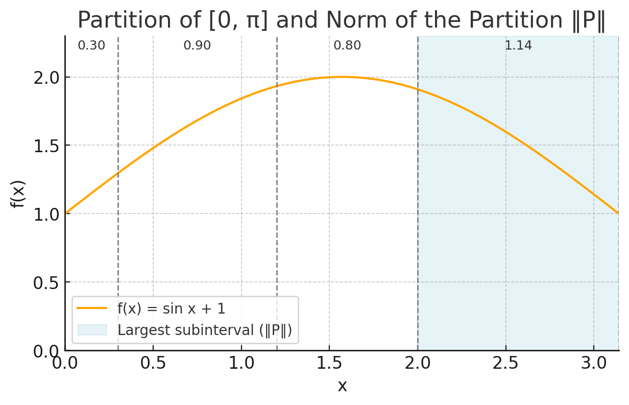 - The norm of a partition \(P = \{x_0,x_1,...,x_n\}\) is the number $$\lVert P \rVert = \max_{1 \leq j \leq n} |x_j - x_{j-1}|$$