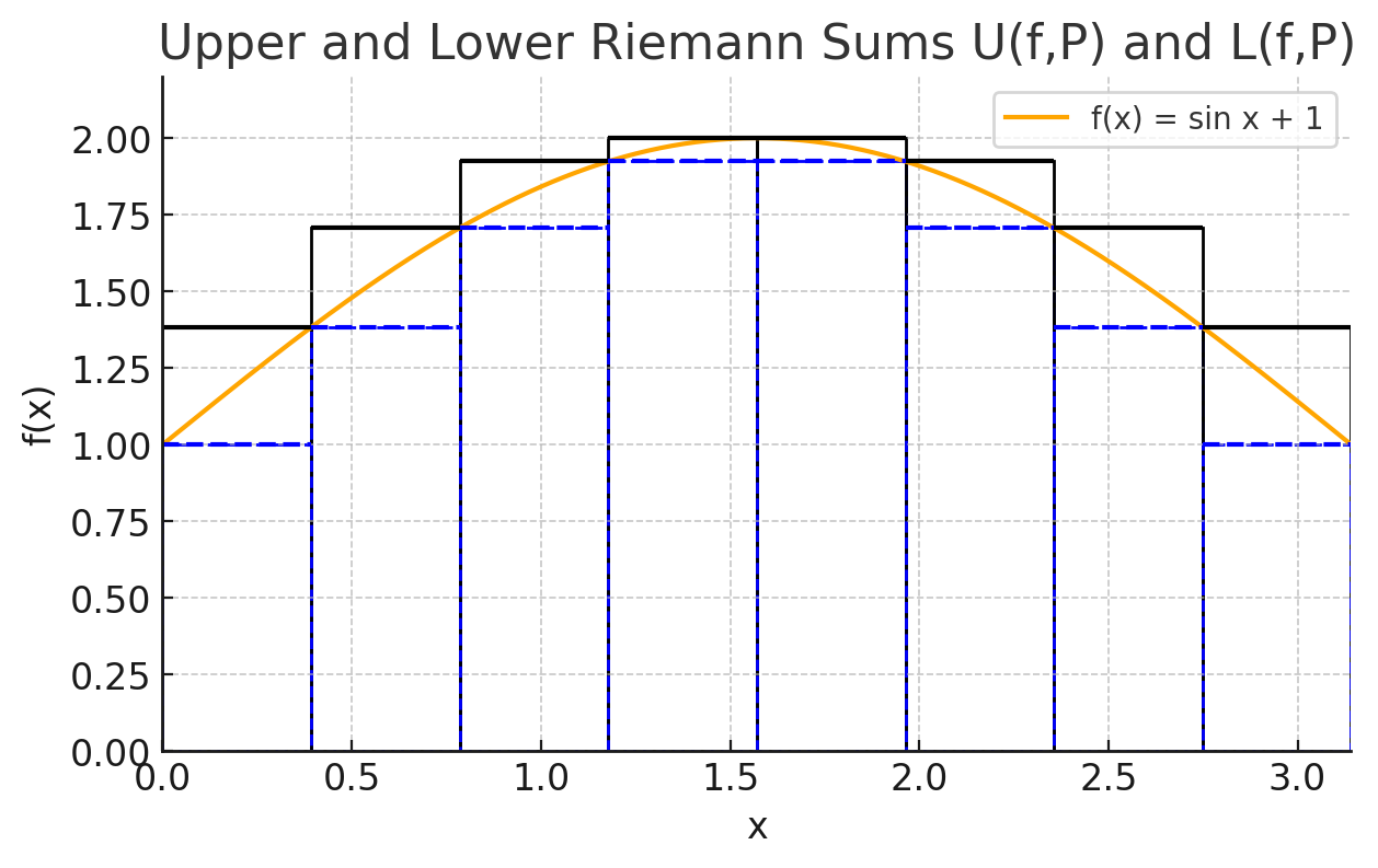 - The Upper Riemann Sum of \(f\) over \(P\) is the number $$U(f,P) := \sum_{j = 1}^{n} M_j(f) \Delta x_j$$ where $$M_j(f) := \sup f([x_{j-1}, x_j]) := \sup_{t \in [x_{j-1}, x_j]} f(t) $$